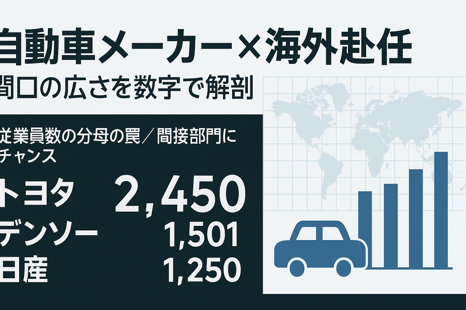 今日はちょっと趣向を変えまして部品メーカー→OEM→海外駐在の私が、「自動車メーカーは従業員が多い=駐在は狭き門」という通説を、いただいた駐在者数ランキング表と現場目線でひっくり返します。