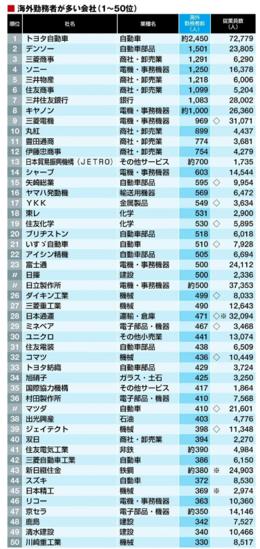 手元の表では、トヨタ自動車が約2,450人規模の駐在者で上位。
